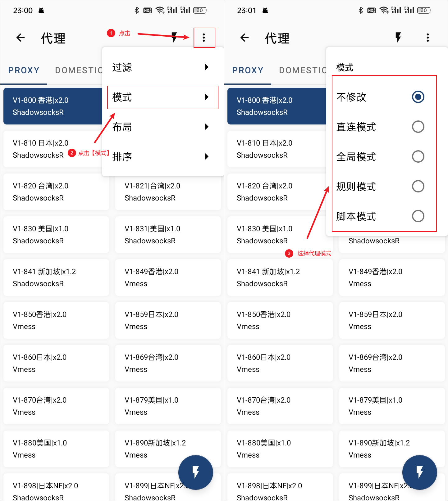 在上图中的代理页面,点击左上角的图标,在弹出的窗口中点击模式,即可切换代理模式,如下图所示。